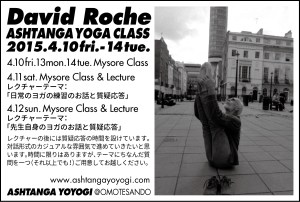 レクチャーの後には質疑応答の時間を設けています。 対話形式のカ ジュアルな雰囲気で進めていきたいと思います。 時間に限りはありますが、テーマにちなんだ質問を一つ(それ以上で も!)ご用意してお越しください。 4/11(土) 「日常のヨガの練習のお話」と「質疑応答」 アシュタンガヨガの日々の実践をどのように続けて行くかをとりあ げます。 ケガや身体の不調を抱えた練習生が世界中に大勢います。時にはさま ざまなな状況により練習をすることができない場合もあります。しか し多くの生徒ができることならアシュタンガヨガを含め、アーサナの 実践を続けて行きたいとも考えています。 私達がそれぞれの状況において、それぞれのユニークな身体を持ちな がら、どのように実践を続けていけるか、実践者そして指導者として の長いキャリアと経験からデイビッドがお話しします。またこの機会 に日々のヨガの実践について、ぜひ質問してください。 4/12(日) 「デイビッド先生自身のヨガのお話」と「質疑応答」 家族、ライフスタイルの変化、引っ越し、年齢など、私達はさまざまな イベントや現実の影響を受けながら暮らしています。 予想のできない出来事や変化の起きる人生を通して、どのようにヨガ を続けてきたのかデイビッド自身の経験をシェアします。ダンサー、 ダンス講師またコリオグラファーとしてのキャリアを持ちながら、ヨ ガの旅と実践を長く継続してきたデイビッドから直接話が聞けるチ ャンスです。自身の暮らしや人生とヨガとの関係についてなど、ぜひ 質問をお寄せください。 ダンスのマーサ・グラハム、沖正弘による沖ヨガの系譜に連なる指導 者である、龍村先生、数珠先生、遠藤先生。そしてシュリ・T・クリシュ ナマチャリヤに連なる伝統的ヨガの指導者たち。 シュリ・K・パッタビジョイス、孫であるシュリ・シャラート・ジョ イスをはじめとする、ティム・ミラー、リチャード・フリーマン、エデ ィー・スターンなどのアシュタンガヨガ講師たち。 そしてシュリ・B・K・S・アイアンガーの第一期・第二期の弟子で あるシャンドール・リミート、ギータおよびプラシャント・アイアン ガー、ラマナンド・パテルとジュディス・ラサター。多くの人々がデ イビッドの生涯を通じて、彼の学びに非常に大きな影響を与えてきま した。 現在70 歳となるデイビッドは、自身の感覚を通してのアシュタン ガ・ヴィンヤサヨガーヨガ・チキッツァ、ナディ・ショーダナ、ステ ィラ・バーガーの経験と、生徒ひとりひとりが持つそれぞれの可能 性と経験を結びつけるため、現在も日々その方法を模索し研鑽し続 けています。 ぜひこの機会にデイビッドの実践者としての、そして指導者としての 長い経験に触れてみてください。これからの長く続く、私達のヨガの 実践に糧をもたらしてくれることでしょう。